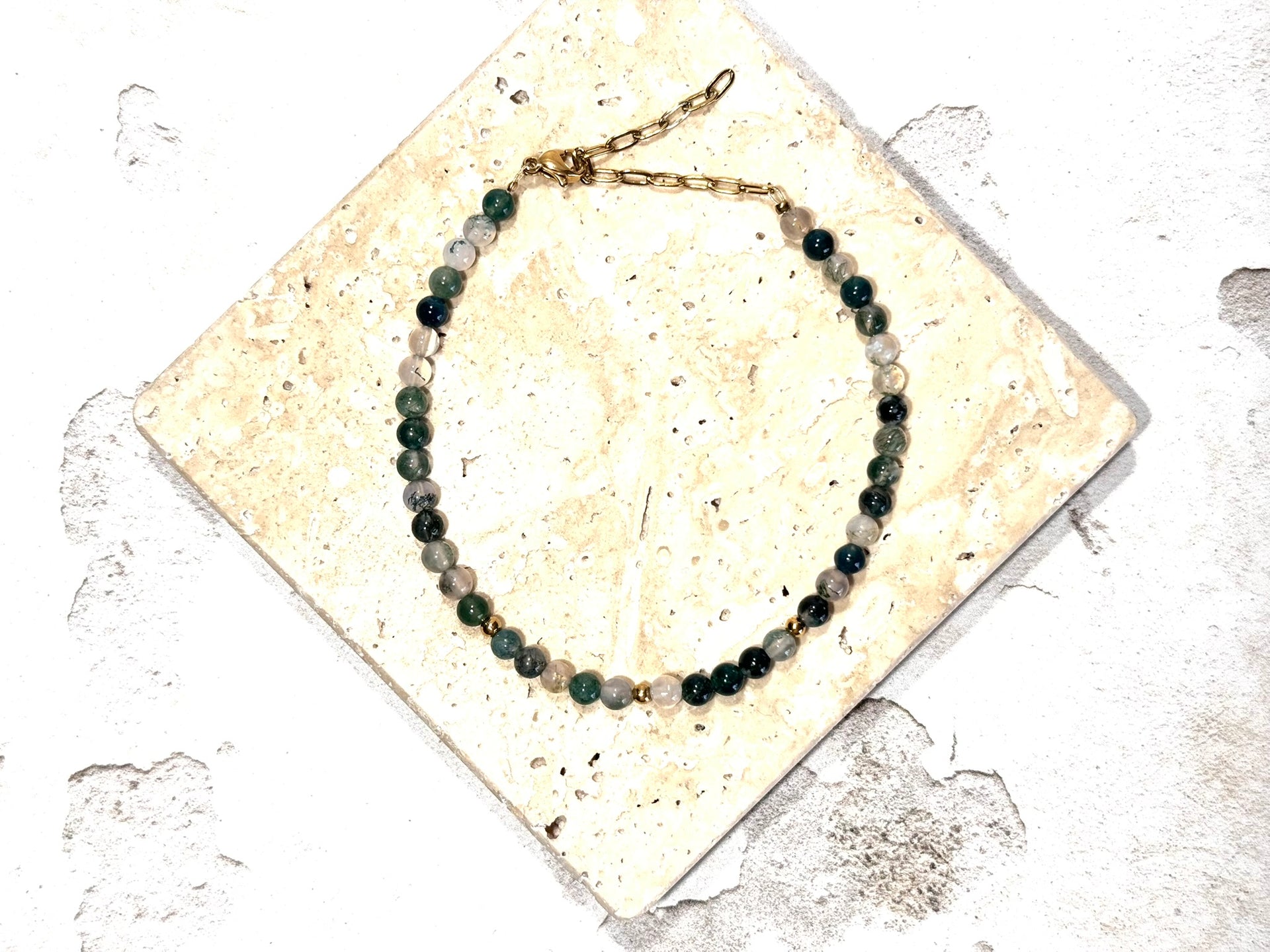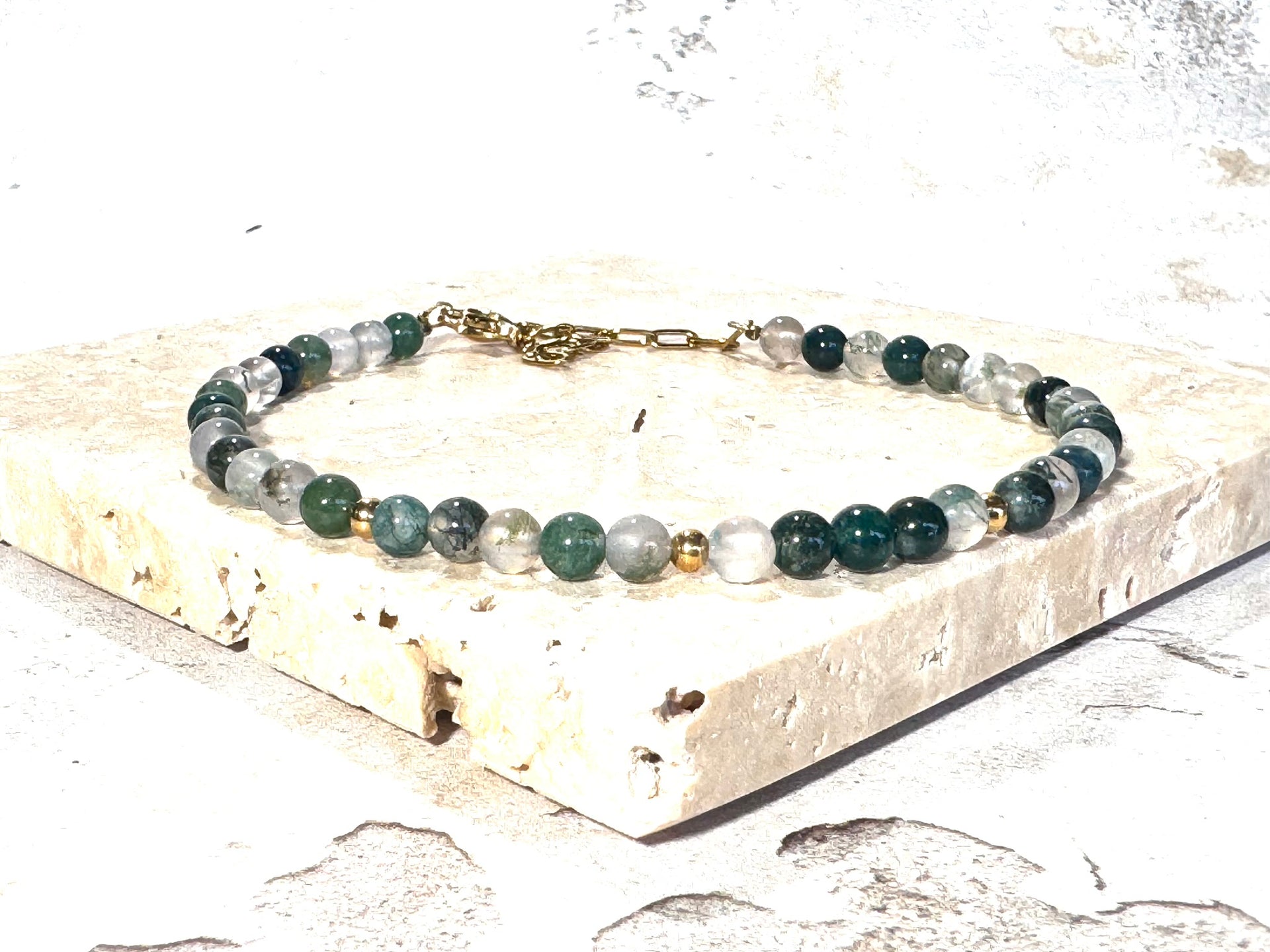 Moss Agate Dainty Crystal Gemstone Bracelet, a true embodiment of elegance and natural beauty. Handcrafted with care in Surrey, UK, this bracelet features real, natural Moss Agate gemstones in a gorgeous soft green hues. The small 4mm faceted beads shimmer delicately, adding a touch of refined sparkle to your wrist.