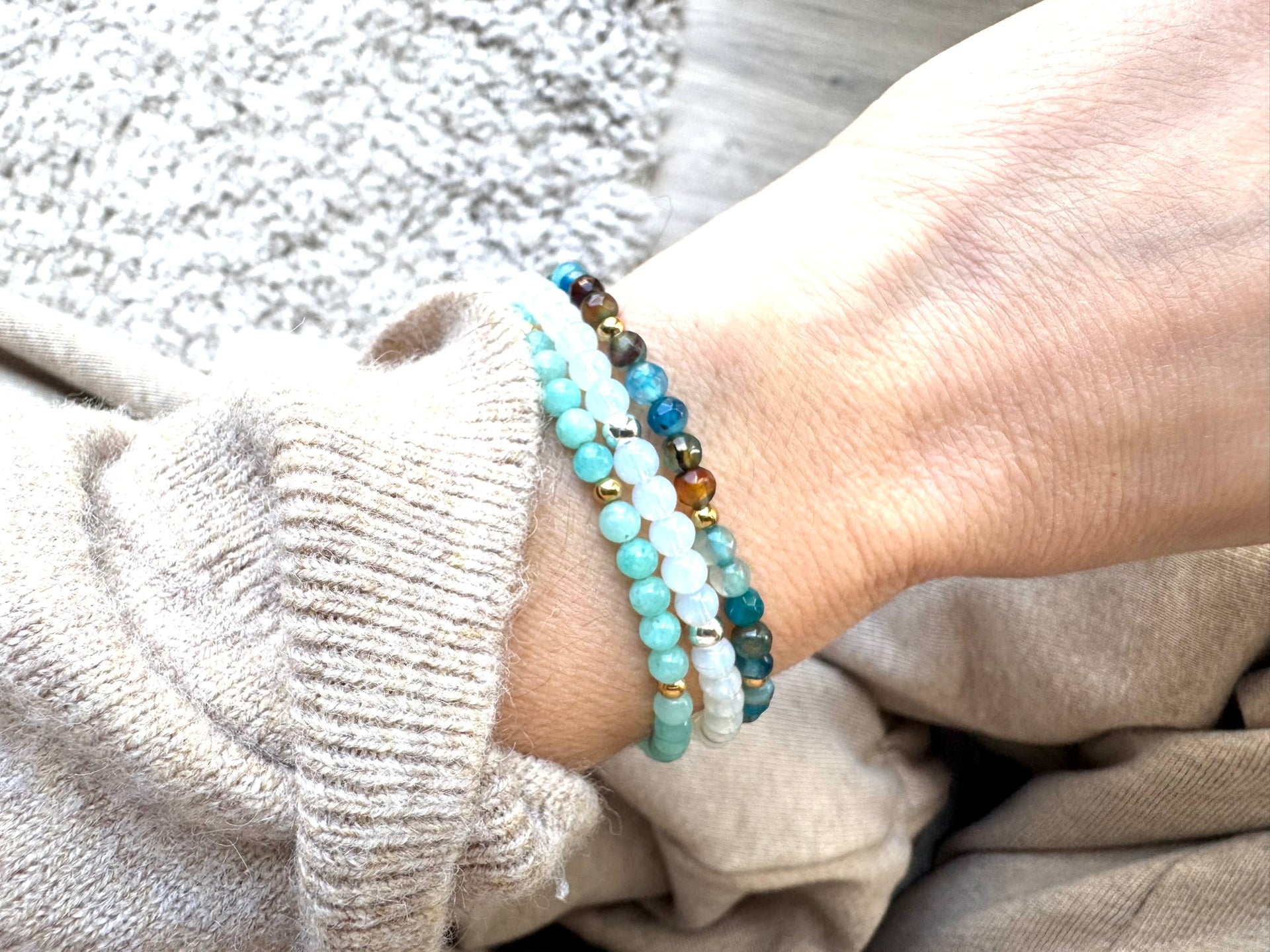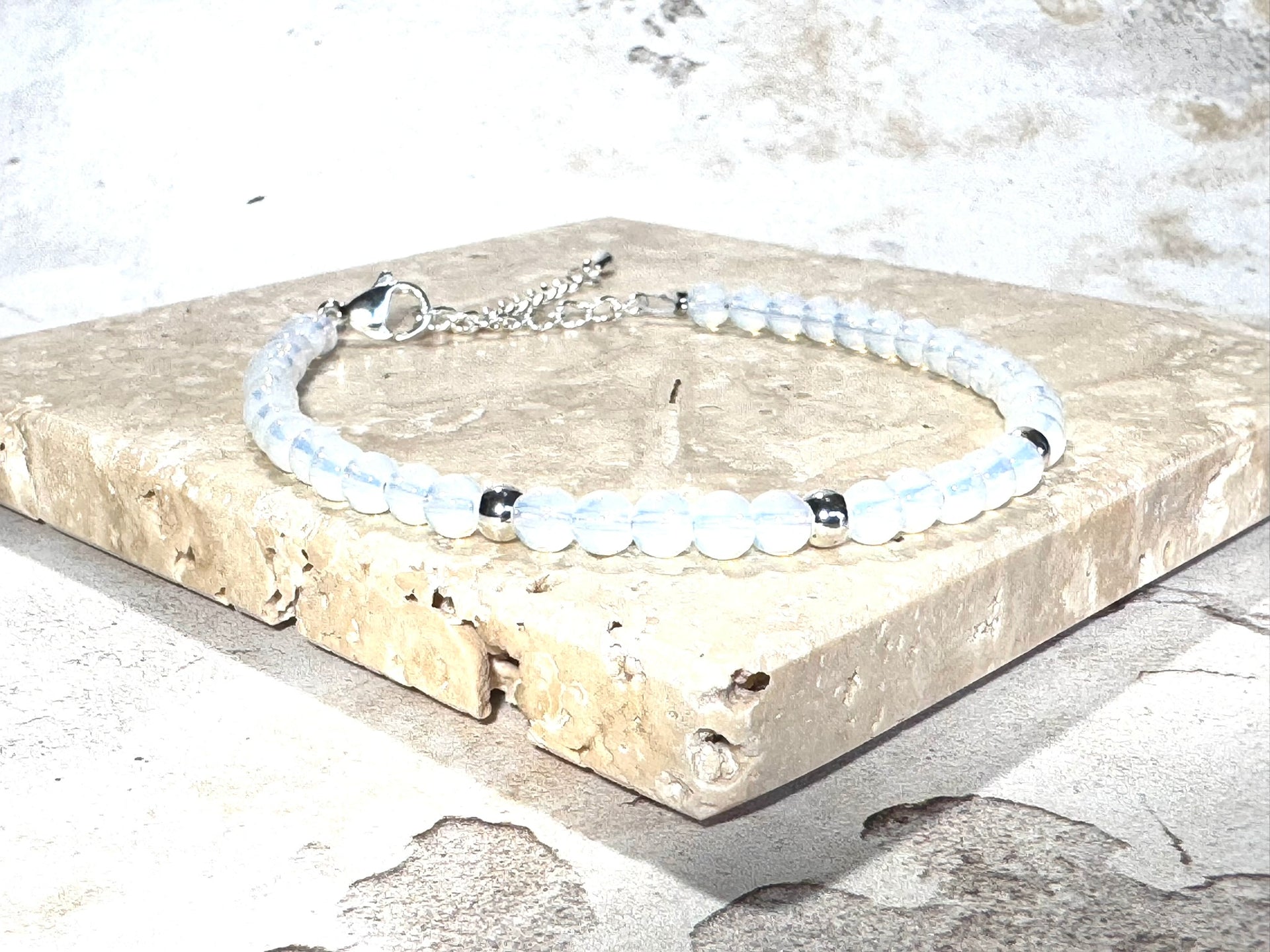 Opalite Dainty Crystal Gemstone Bracelet, a true embodiment of elegance and natural beauty. Handcrafted with care in Surrey, UK, this bracelet features Opalite gemstones in a gorgeous iridescent and clear hues. The small 4mm faceted beads shimmer delicately, adding a touch of refined sparkle to your wrist.