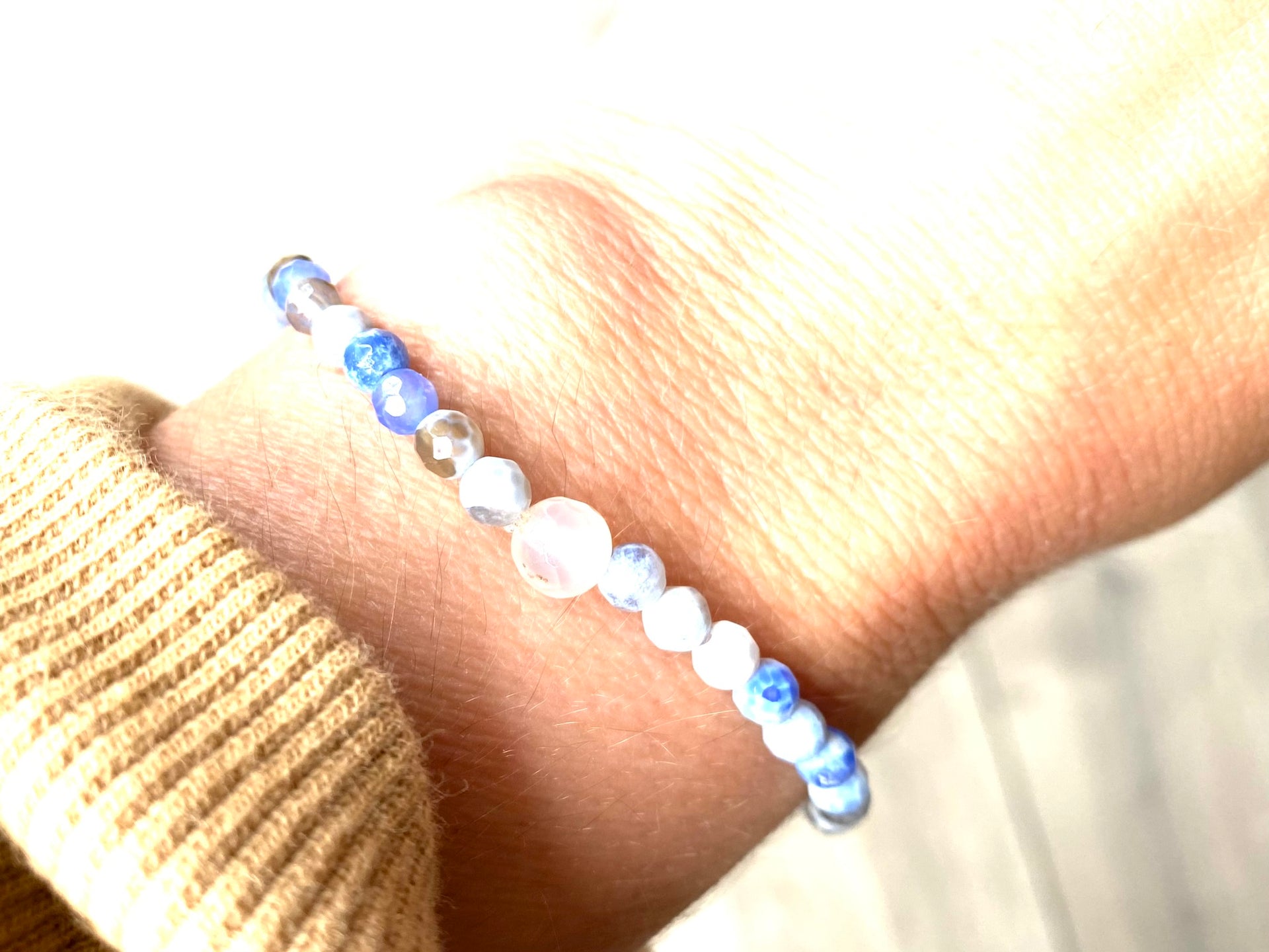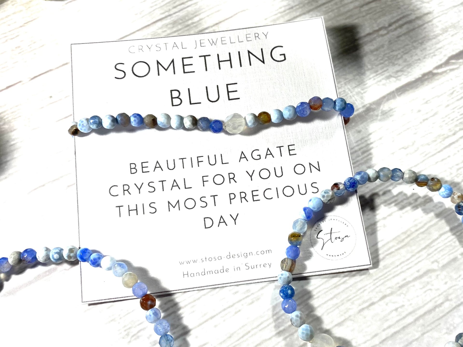 The perfect 'something blue' for the bride on their wedding day, this slim and dainty bracelet has been handmade in the UK with small 4mm cornflower Agate crystal beads, and highlighted with one slightly bigger transparent Jade bead.