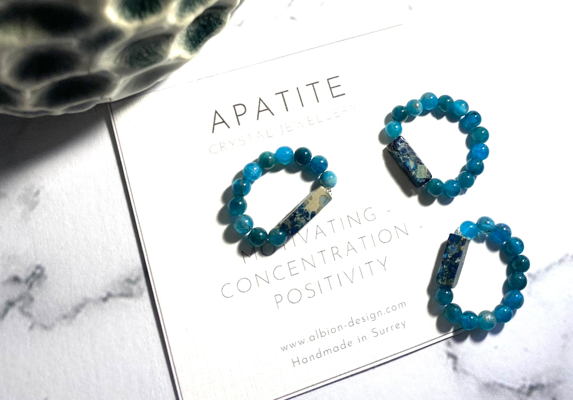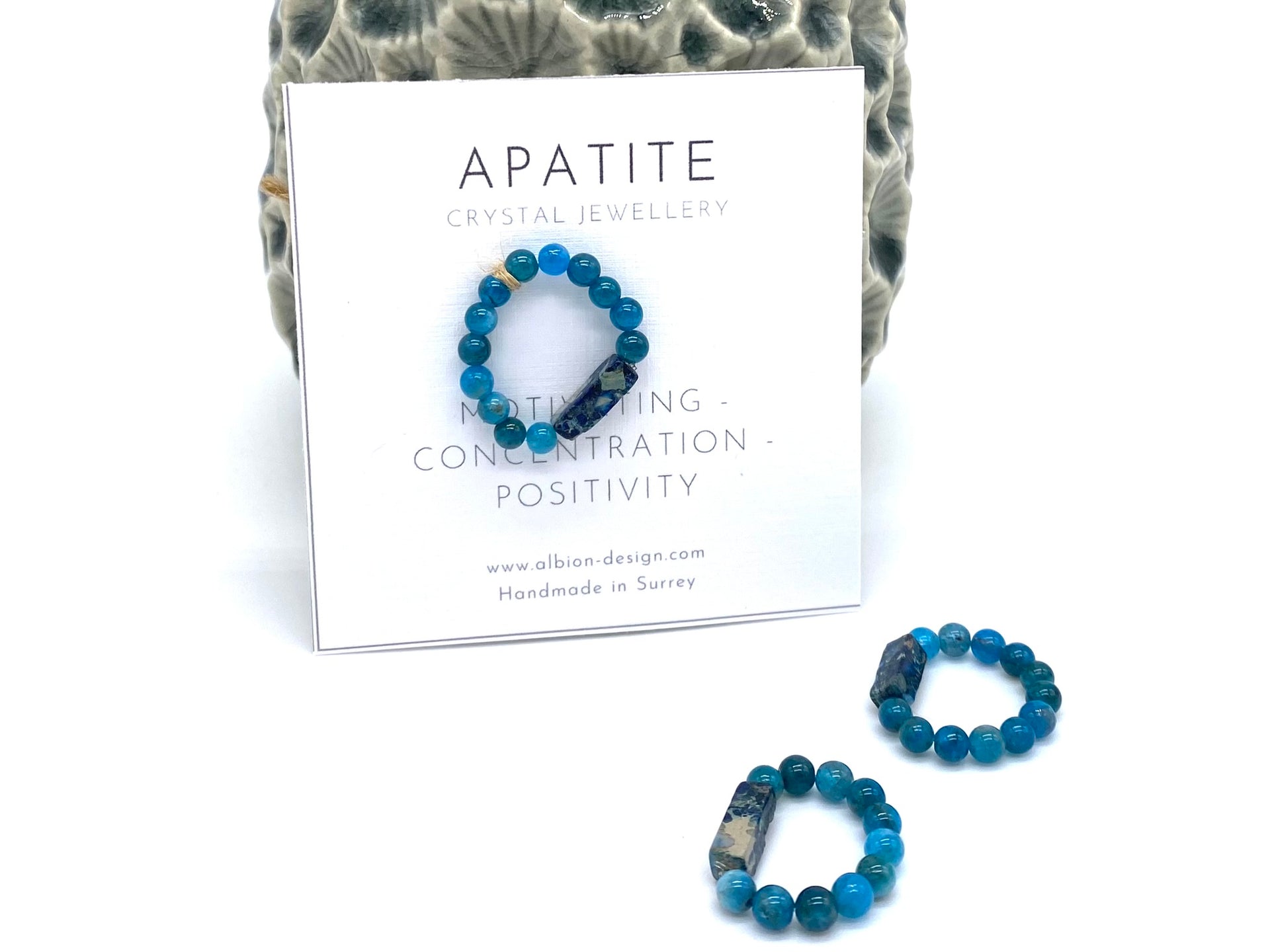Each ring will come on the card as shown which depict some of the qualities of Apatite which are confidence, motivation and positivity.