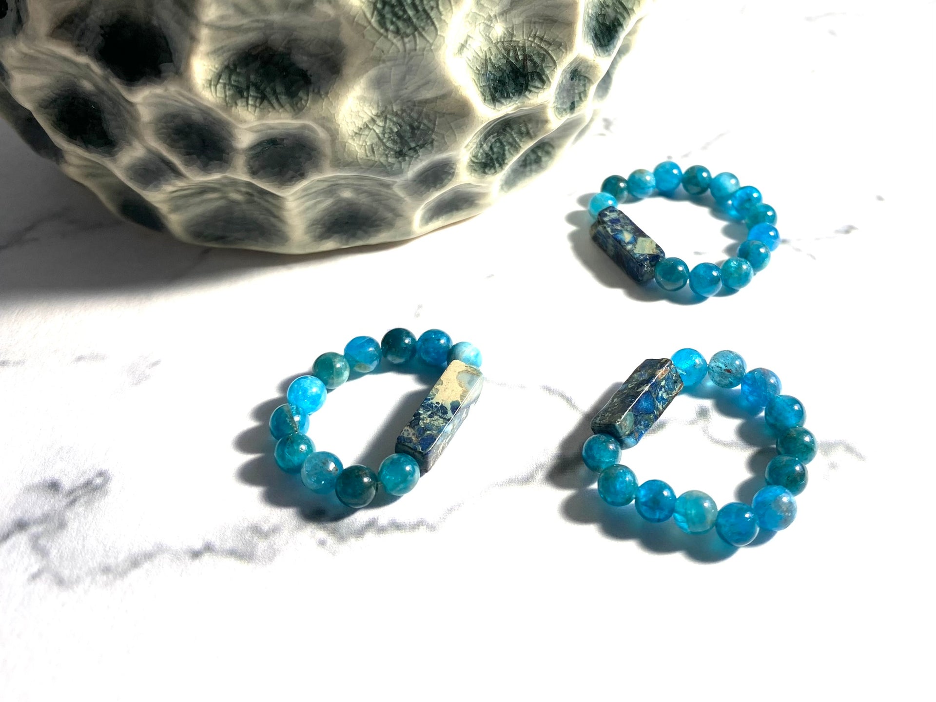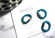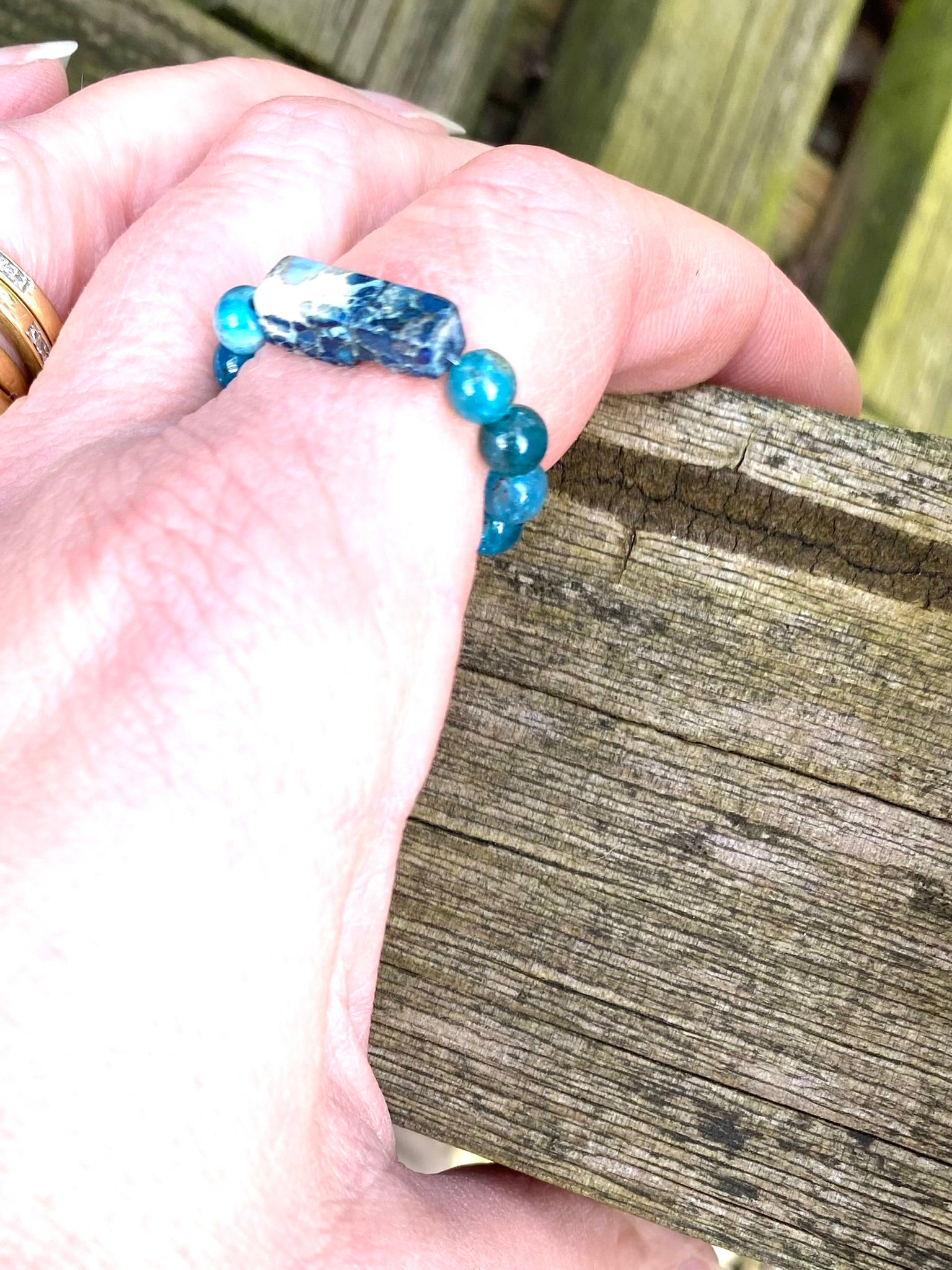 This beautiful ring has a central oblong Apatite crystal bead in the middle - this bead is natural Apatite and it is oblong in shape and around 4mm wide. The other beads are tiny 4mm Apatite crystal beads, in a beautiful turquoise/teal hue. It is a super comfortable ring to wear as well, very easy and light to wear.