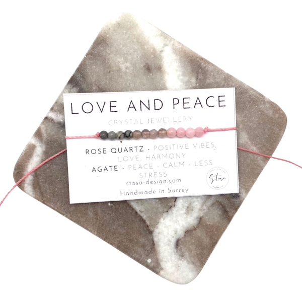 - Love and Peace with Rose Quartz (positive vibes, love, harmony) and Agate (peace, calm, less stress)