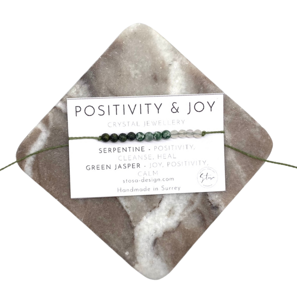 - Positivity and Joy with Serpentine (positivity, cleanse, heal) and Green Jasper (joy positivity, calm)