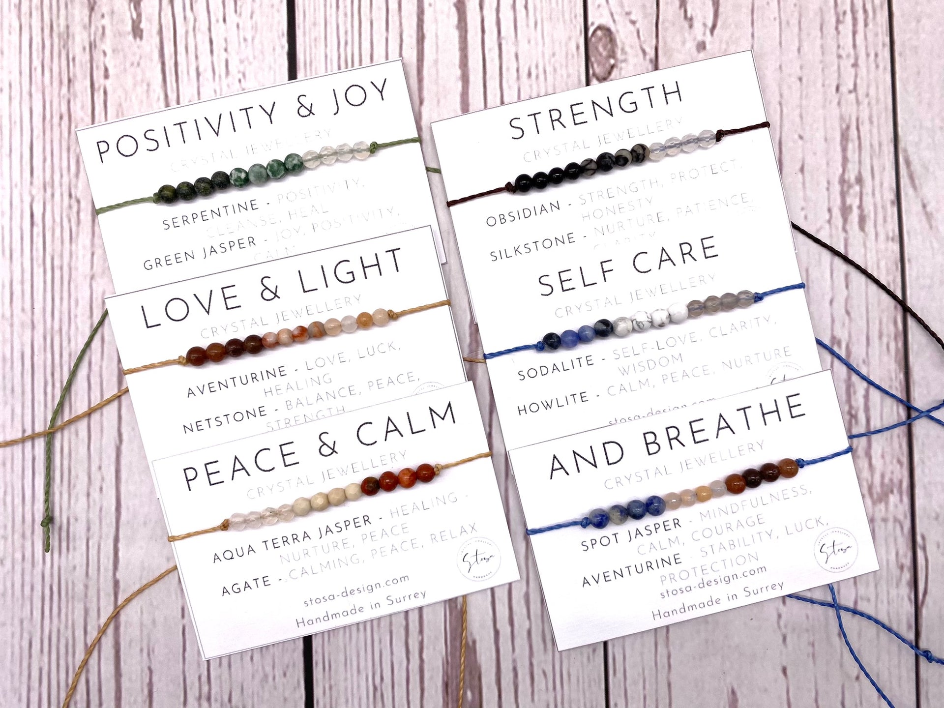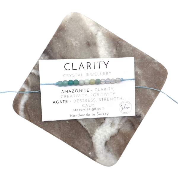- Clarity with Amazonite (clarity, creativity, positivity) and Agates (de-stress, strength, calm)