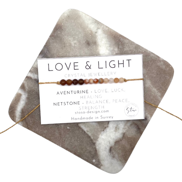 - Love and Light with Aventurine (love, luck, healing) and Netstone (balance, peace, strength)