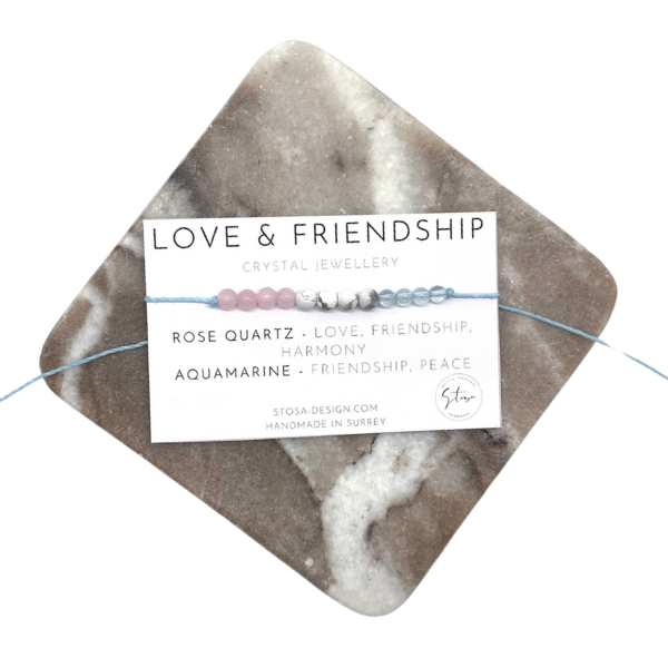 - Love and Friendship with Rose Quartz (love, friendship, harmony) and Aquamarine (friendship and peace)