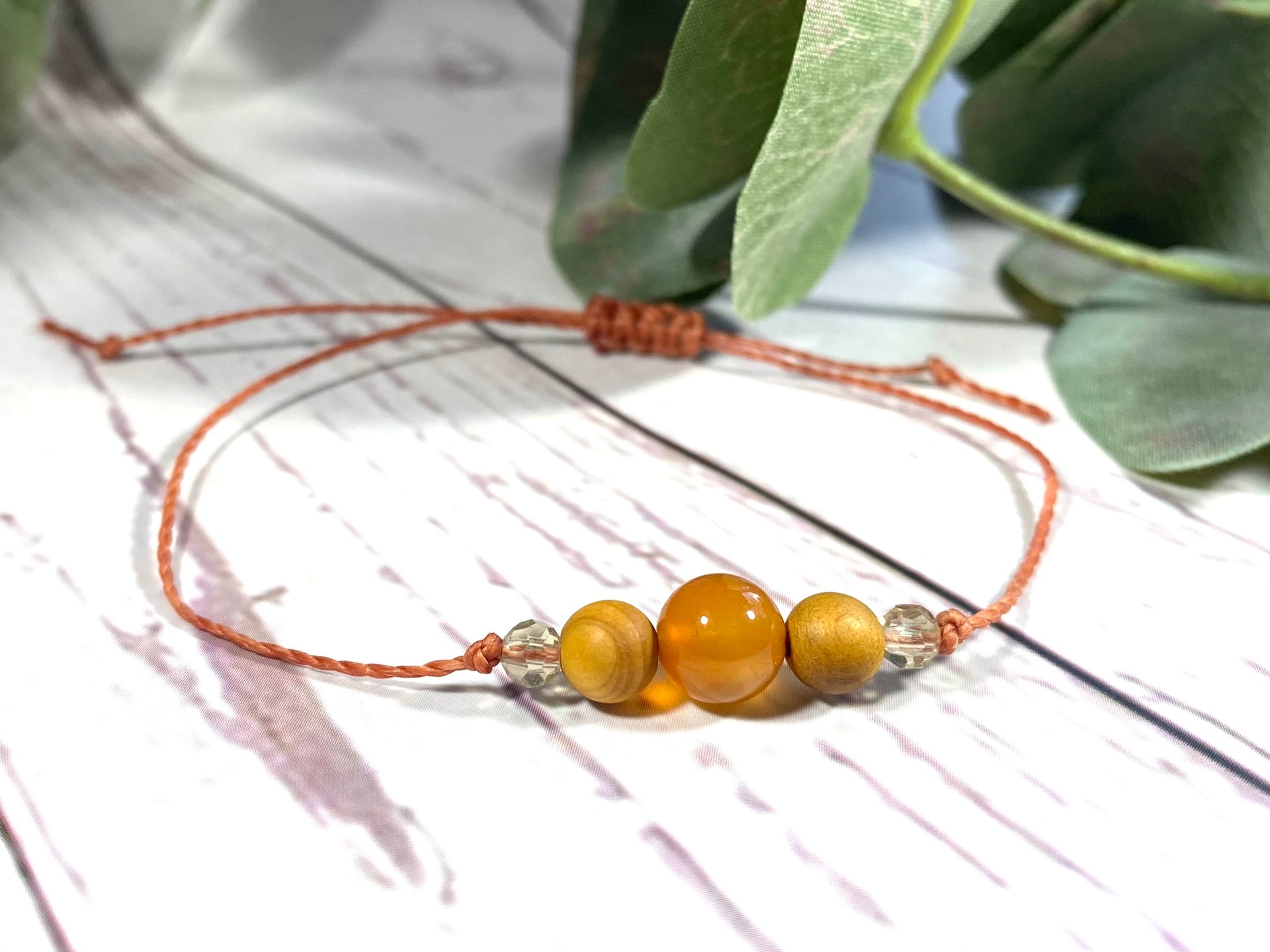 This lovely bracelet is handmade and mounted on the card as shown.  The central bead is a natural crystal of around 8mm in size - beautiful to wear and also great for the soul! The beads to the side of the gemstone are wooden 6mm beads and you can add essential oil to these.