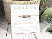 This lovely bracelet is handmade and mounted on the card as shown.  The central bead is a natural crystal of around 8mm in size - beautiful to wear and also great for the soul! The beads to the side of the gemstone are wooden 6mm beads and you can add essential oil to these.