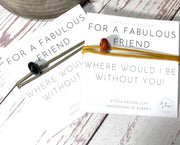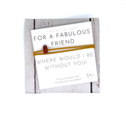 The adjustable closure not only ensures a comfortable fit but also allows for easy removal and wear. It has an accompanying gift card, bearing the heartfelt message: "For a fabulous friend, where would I be without you." This sentiment serves as a constant reminder of the special connection shared between friends.