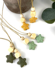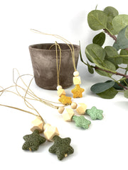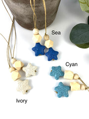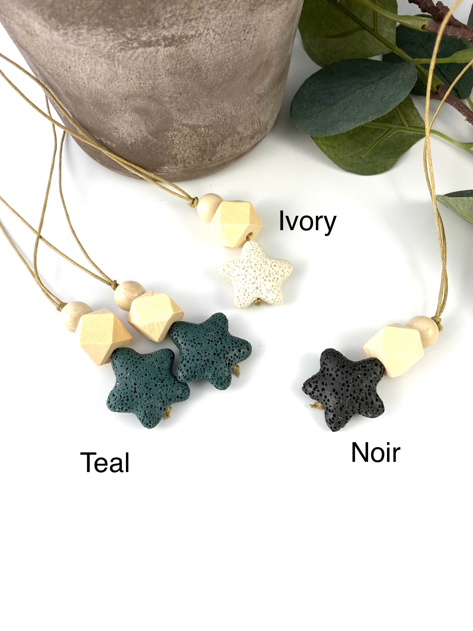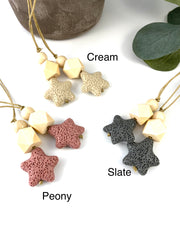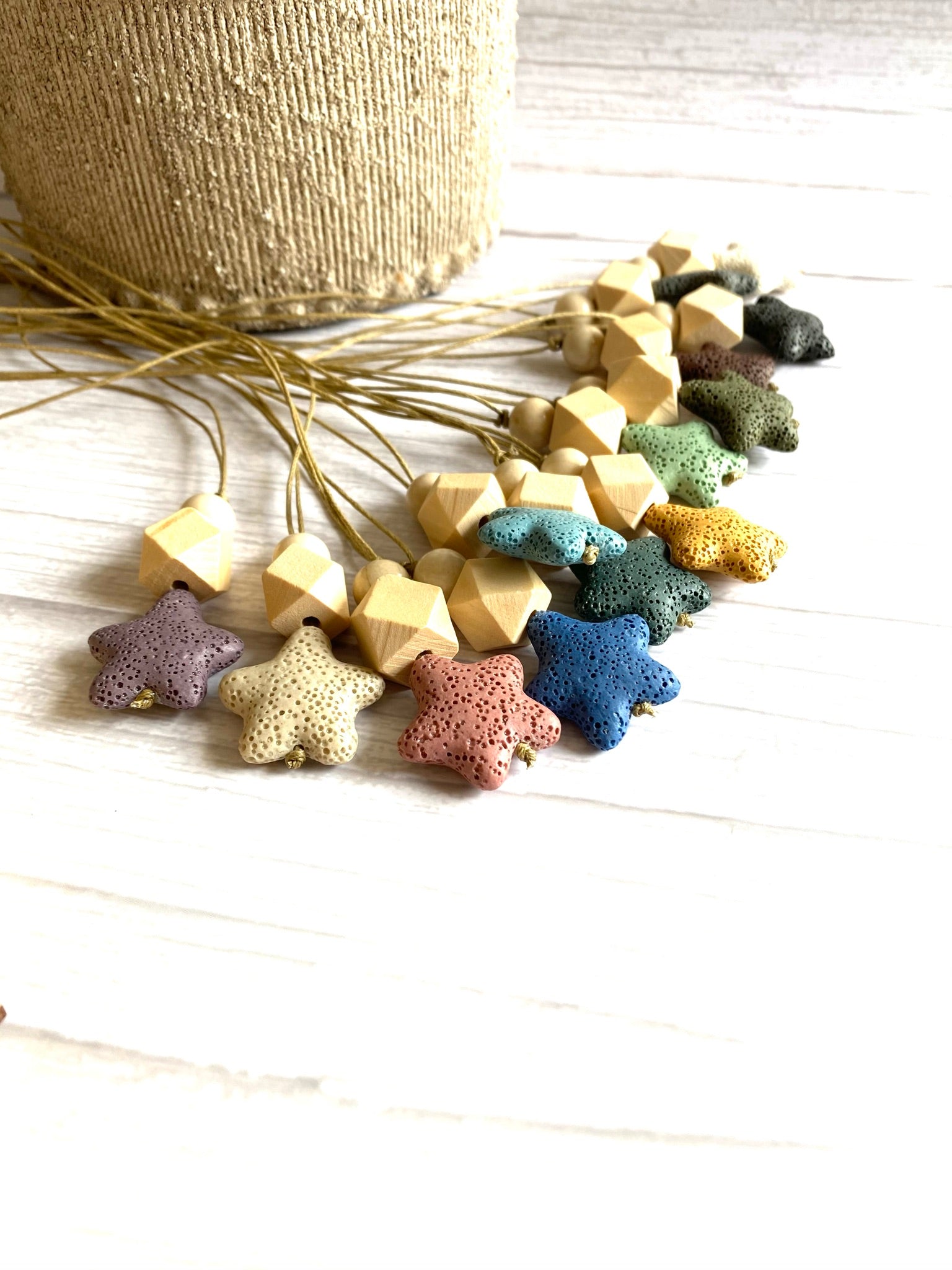 I have made them from large 15mm natural Lava rock shaped in a star, with a Petrified Wooden bead and a natural wooden deep cut faceted bead. These are all natural products.