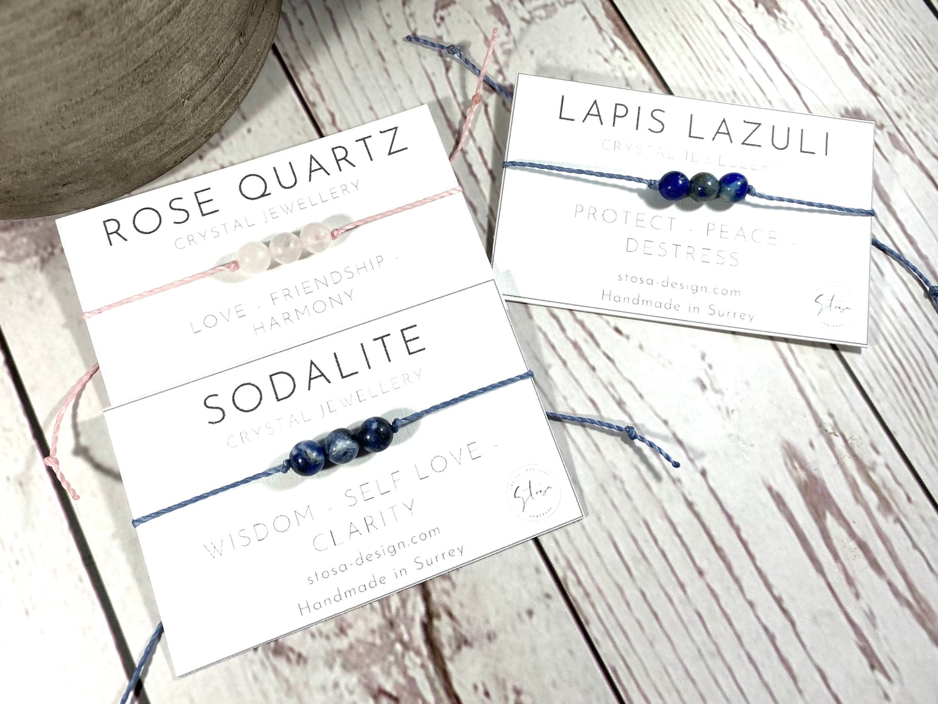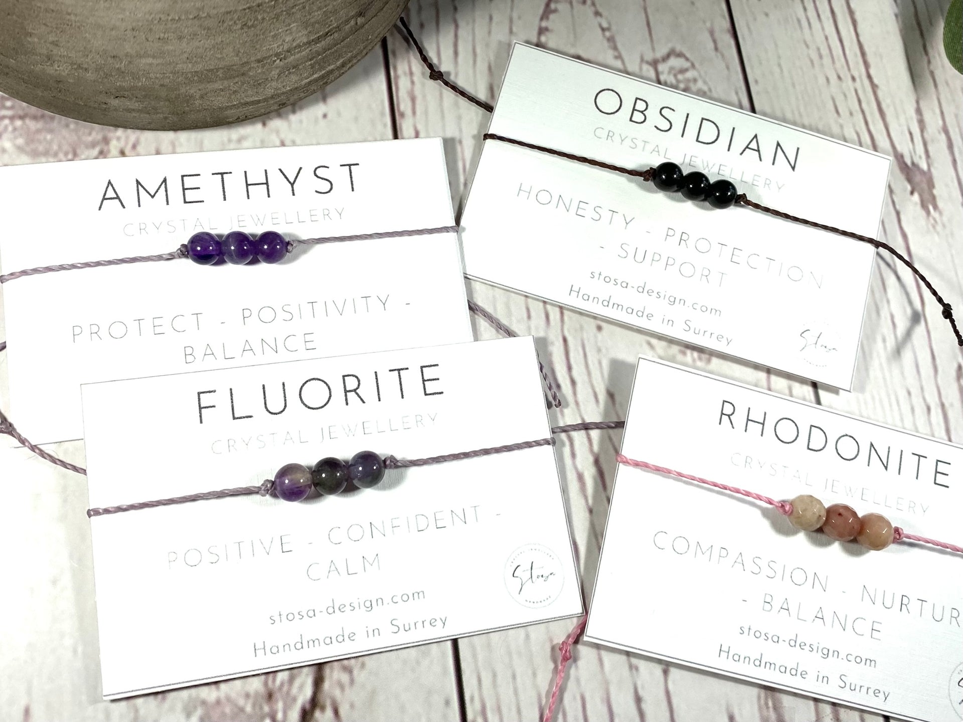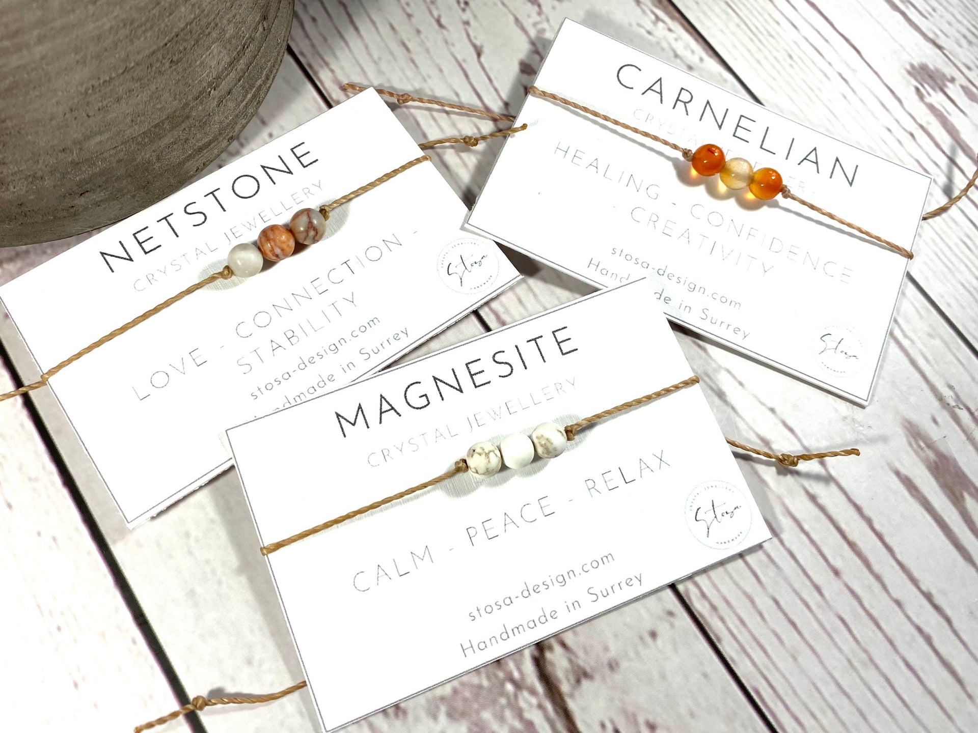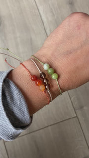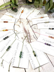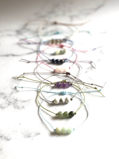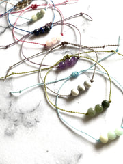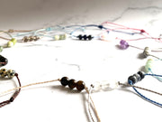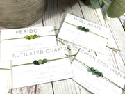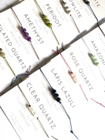 I have set the crystals on a lovely waxed cord which compliments the gemstones. The cord is fine but strong and I have made it with a macramé knot closure so you don't need to tie it on - please note this is a different style as per my previous bracelets as it is easier to put on.