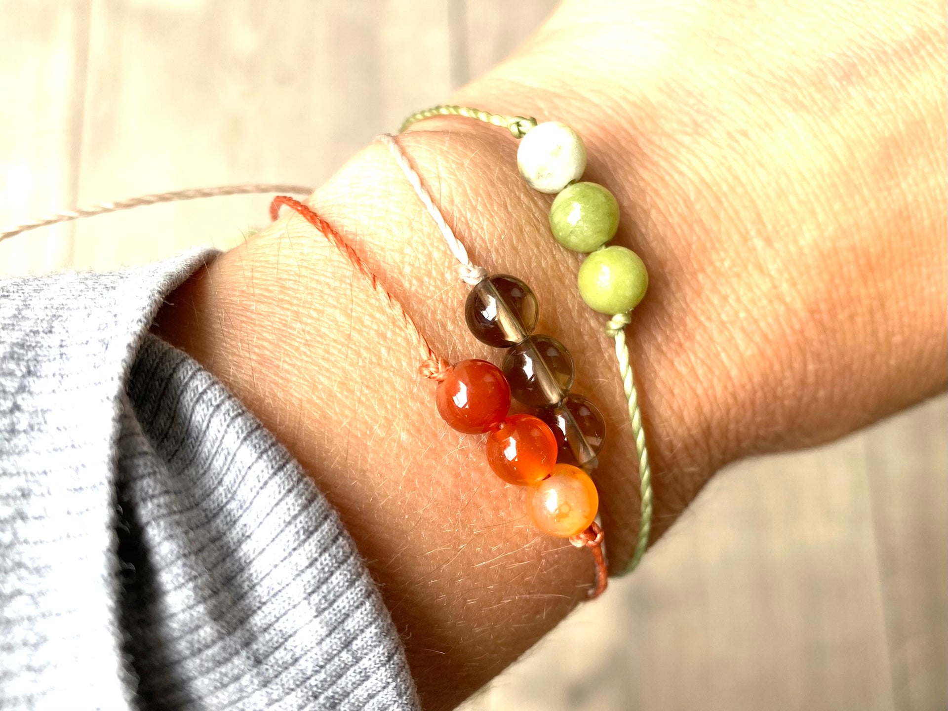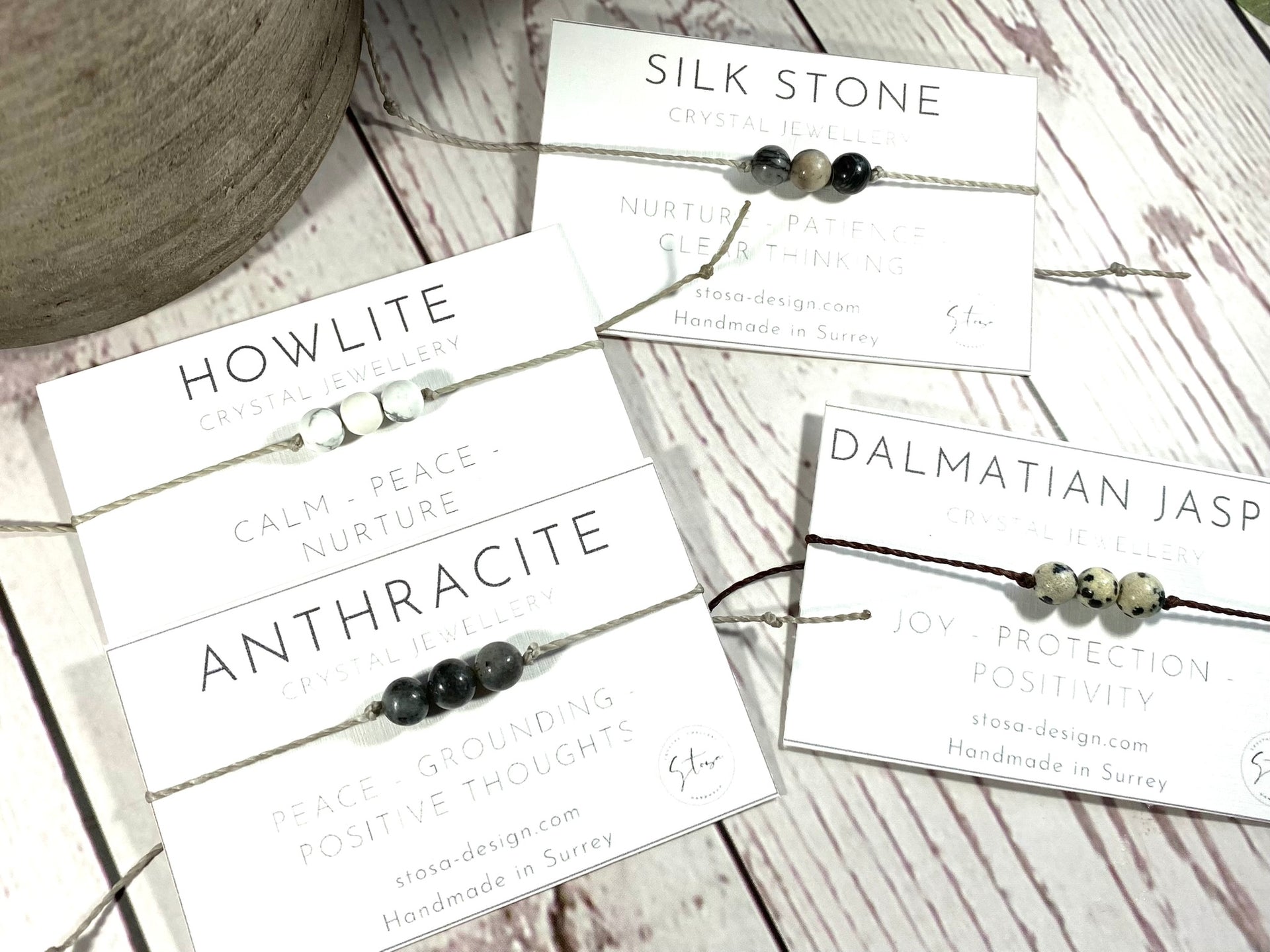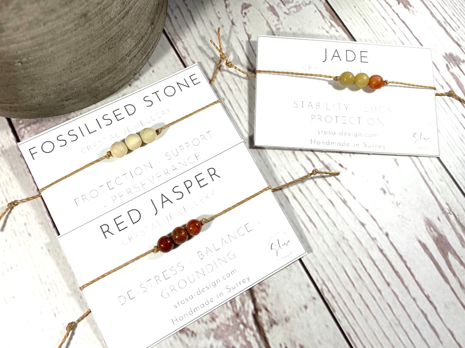 I have set the crystals on a lovely waxed cord which compliments the gemstones. The cord is fine but strong and I have made it with a macramé knot closure so you don't need to tie it on - please note this is a different style as per my previous bracelets as it is easier to put on.